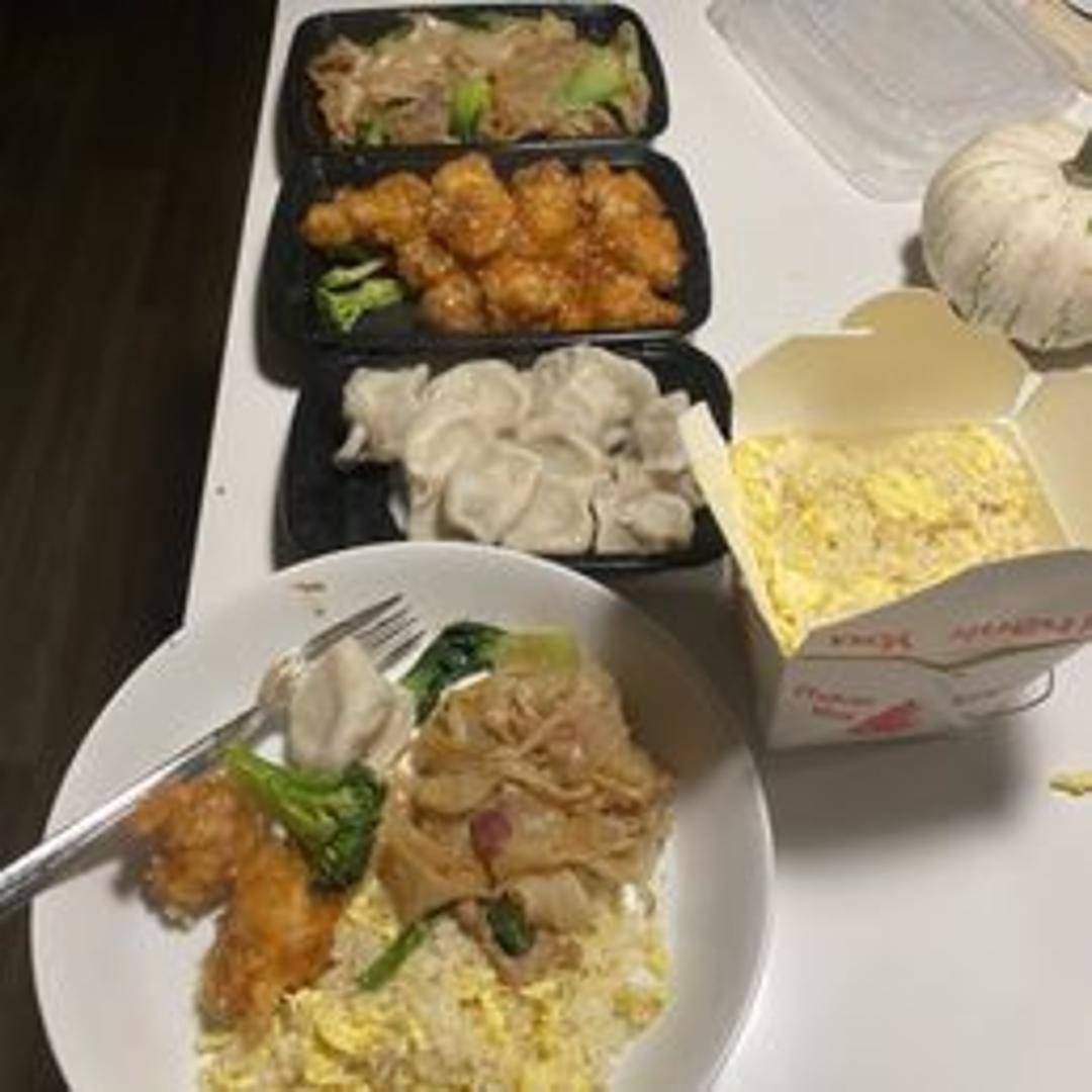 Wide rice noodles stir-fried with tender sliced beef, bean sprouts, scallions, and onions in a savory soy-based sauce.