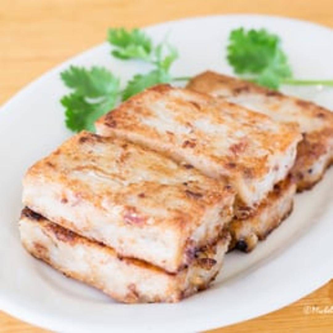 Savory turnip cake made from shredded daikon radish, rice flour, and dried shrimp, pan-fried to a golden brown. Served with a dipping sauce.