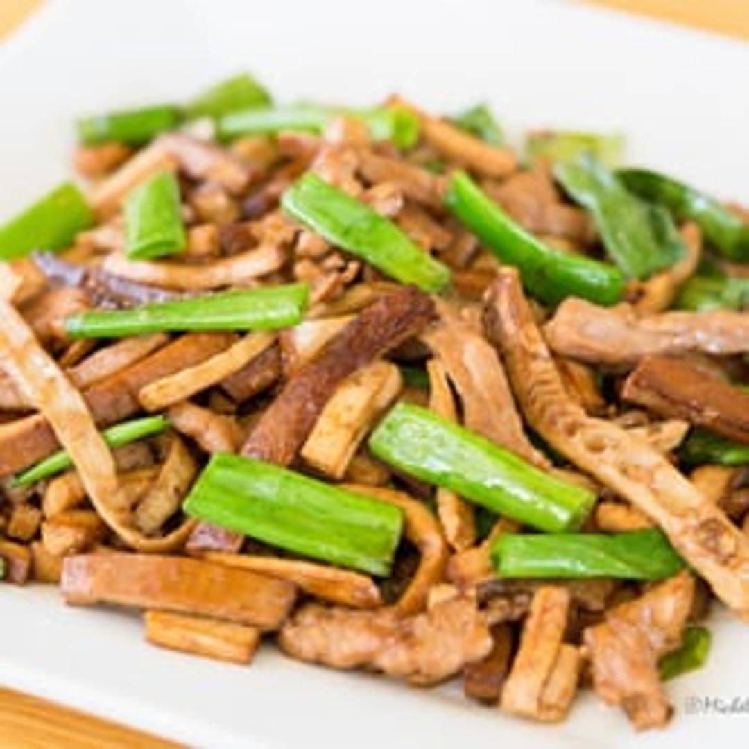 Thinly shredded pork stir-fried with a savory and slightly sweet bean paste sauce. Served with thin pancakes, scallions, and cucumber for wrapping. A Northern Chinese specialty.