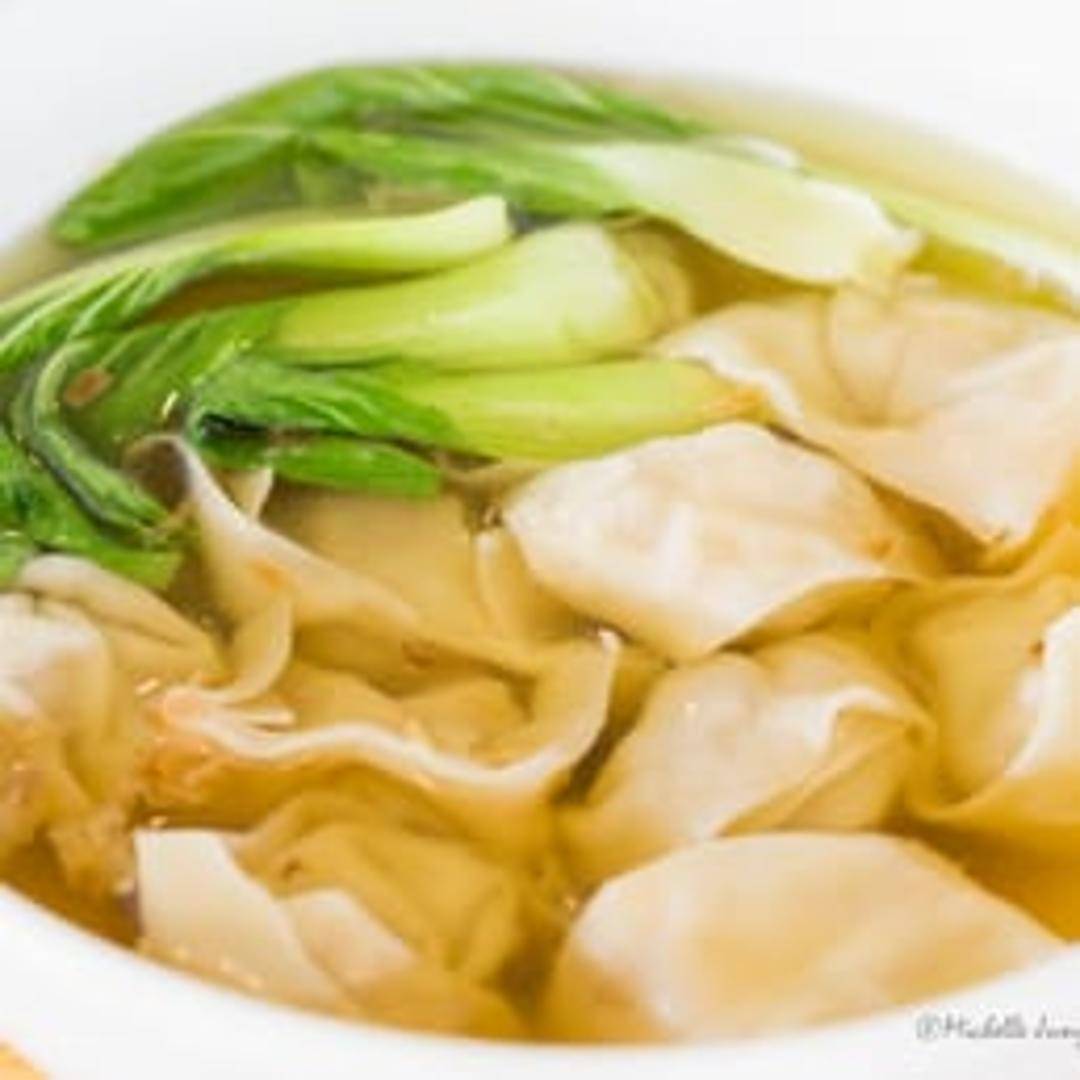 A comforting soup featuring delicate wontons filled with seasoned pork and shrimp, simmered in a clear broth with vegetables and scallions.