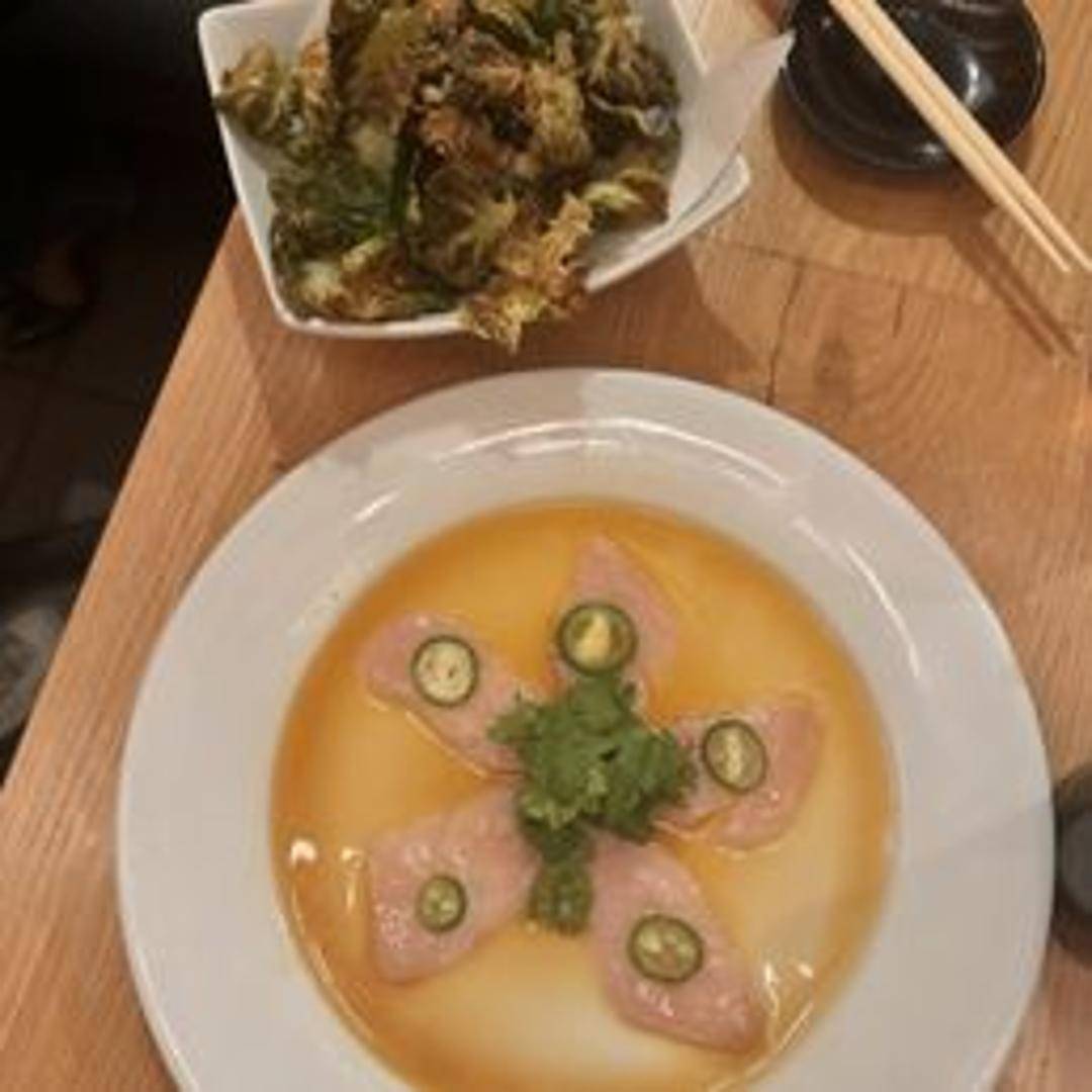 Thinly sliced yellowtail sashimi topped with spicy serrano peppers, ponzu sauce, and cilantro. Offers a balance of fresh, clean flavors with a spicy kick and a citrusy aroma.