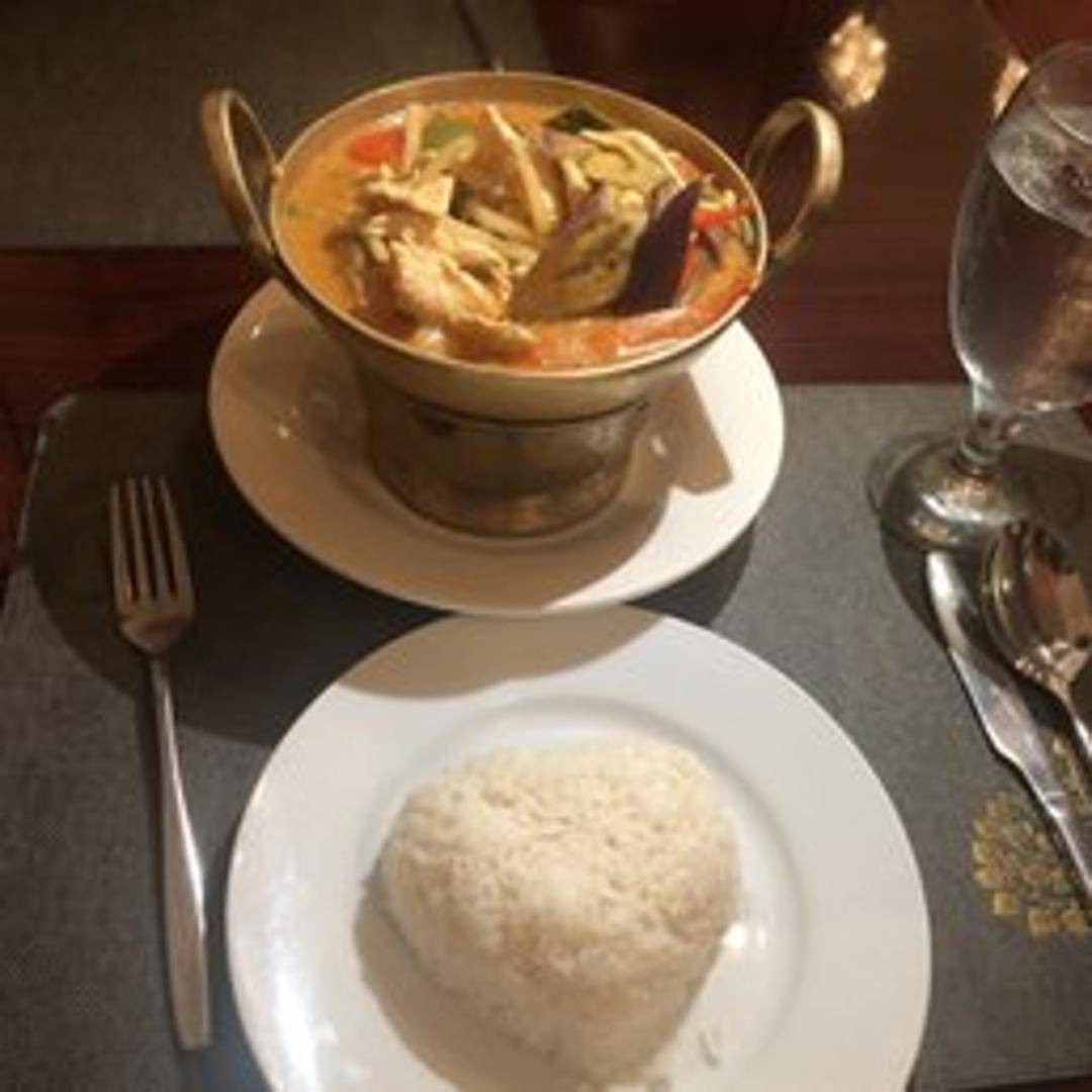 A vibrant and flavorful Thai curry prepared with red curry paste, coconut milk, bamboo shoots, bell peppers, basil leaves, and your choice of protein (chicken, beef, pork, tofu, or shrimp). Served with steamed rice.