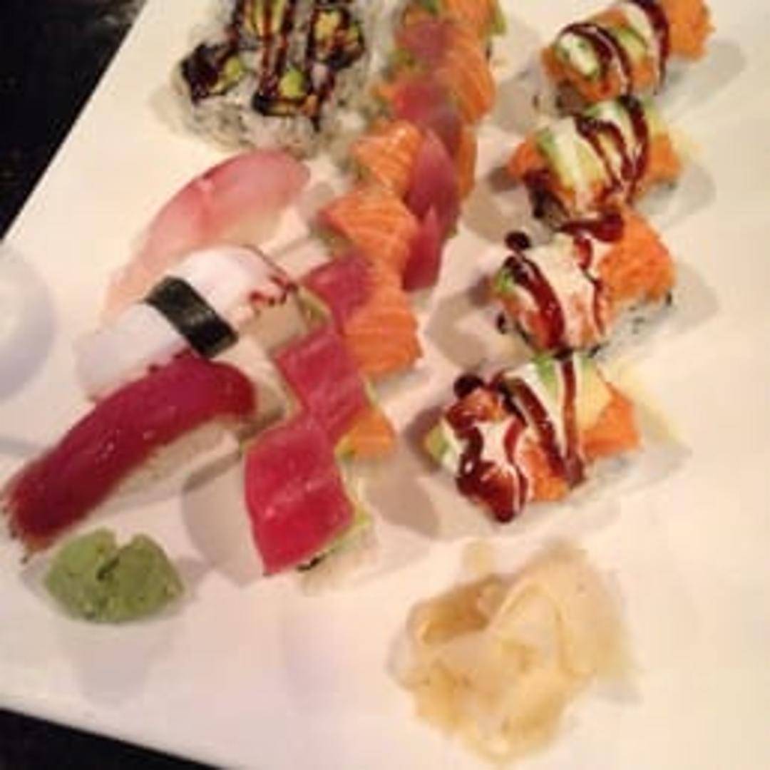 Crab, avocado, and cucumber inside, topped with assorted fish and avocado.