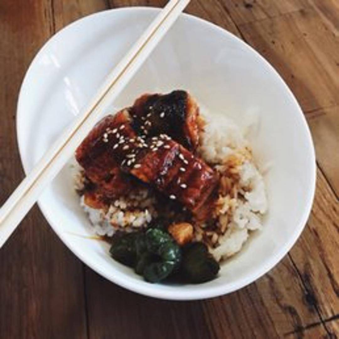 A hearty and comforting Japanese rice bowl featuring tender, savory pork simmered in a flavorful sauce, served generously over a bed of fluffy steamed rice. A satisfying and wholesome meal that captures traditional Japanese comfort food.