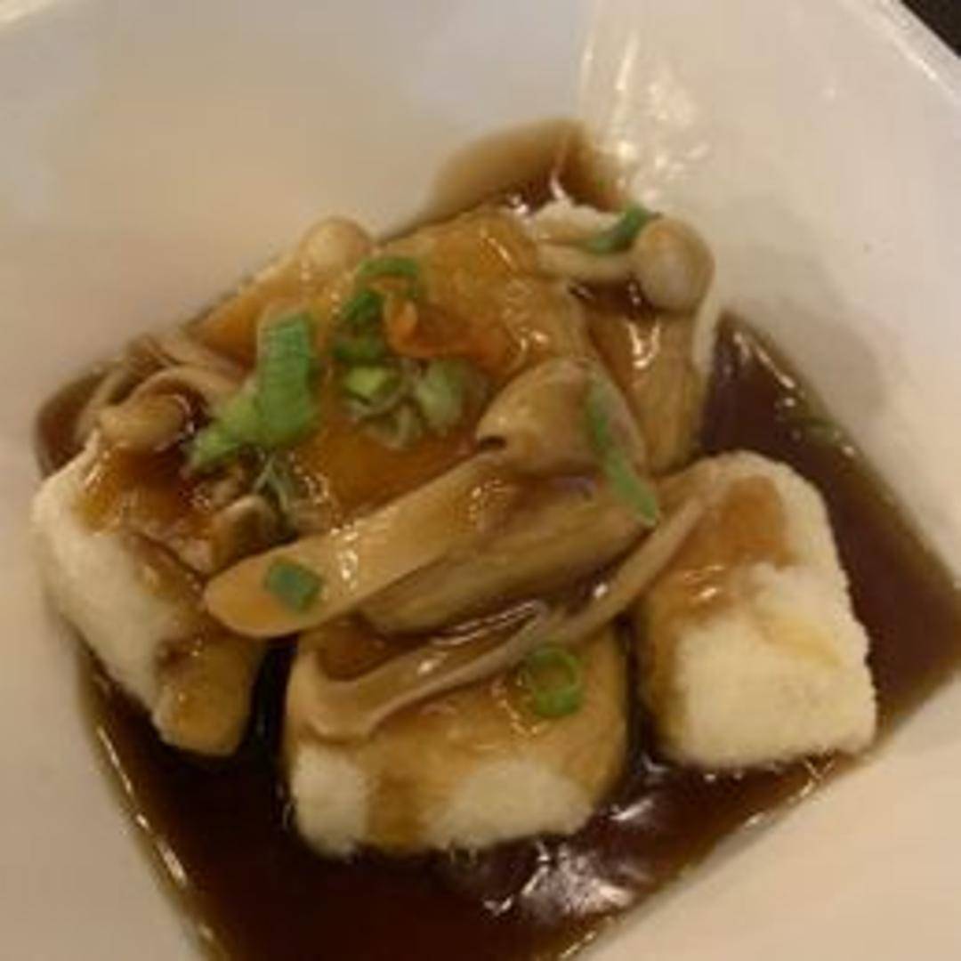 A classic Japanese comfort dish featuring silken tofu, lightly dusted with starch and deep-fried to achieve a delicate crispy exterior and a supremely soft interior. Served in a savory dashi-based broth and garnished with tender mushrooms, offering a harmonious blend of textures and umami flavors.