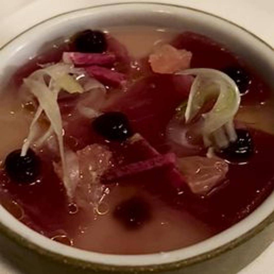 Thinly sliced, raw tuna prepared in the style of crudo. Expect delicate flavors enhanced by citrus, high-quality olive oil, and fresh herbs. Garnished for visual appeal and balanced flavor.