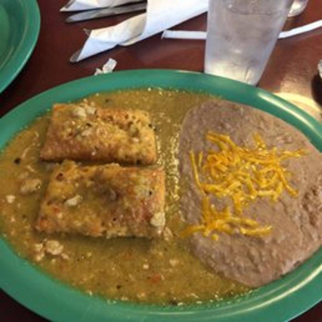 Two poblano peppers stuffed with cheese, battered and fried to golden perfection, and smothered in your choice of green or red chili. Served with rice and beans.