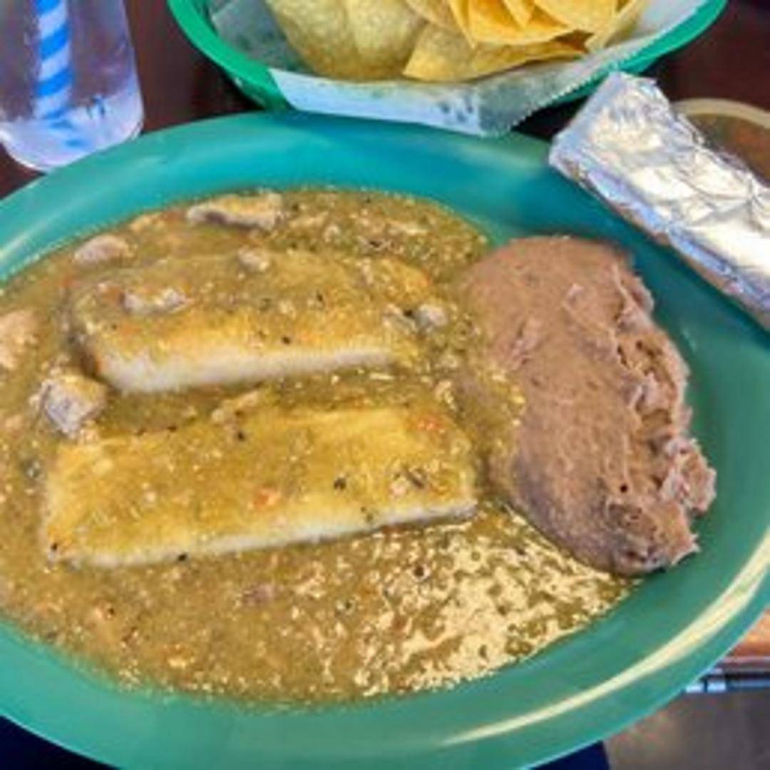 Two homemade tamales filled with your choice of pork or chicken, steamed to perfection and smothered in your choice of green or red chili. Served with rice and beans.