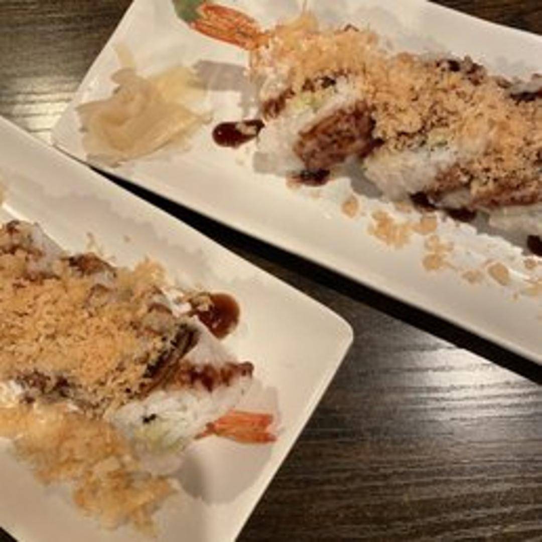 A sushi roll featuring tempura flakes (crunch) for added texture. Typically filled with shrimp tempura, avocado, and cucumber, and often drizzled with eel sauce and spicy mayonnaise.