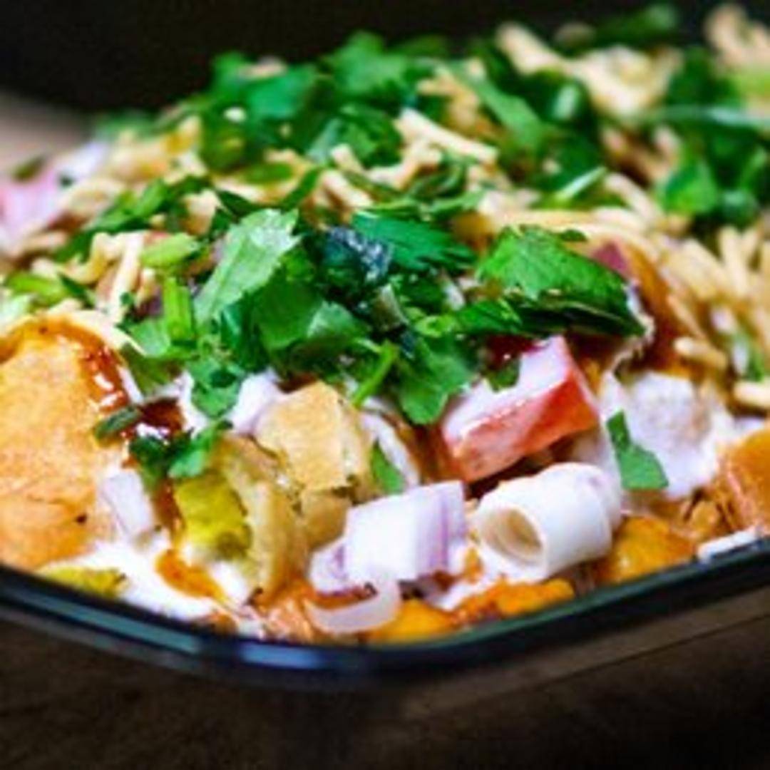 Crushed samosas topped with chickpeas, yogurt, chutneys (tamarind and mint-coriander), onions, and spices. A flavorful and tangy street food snack.