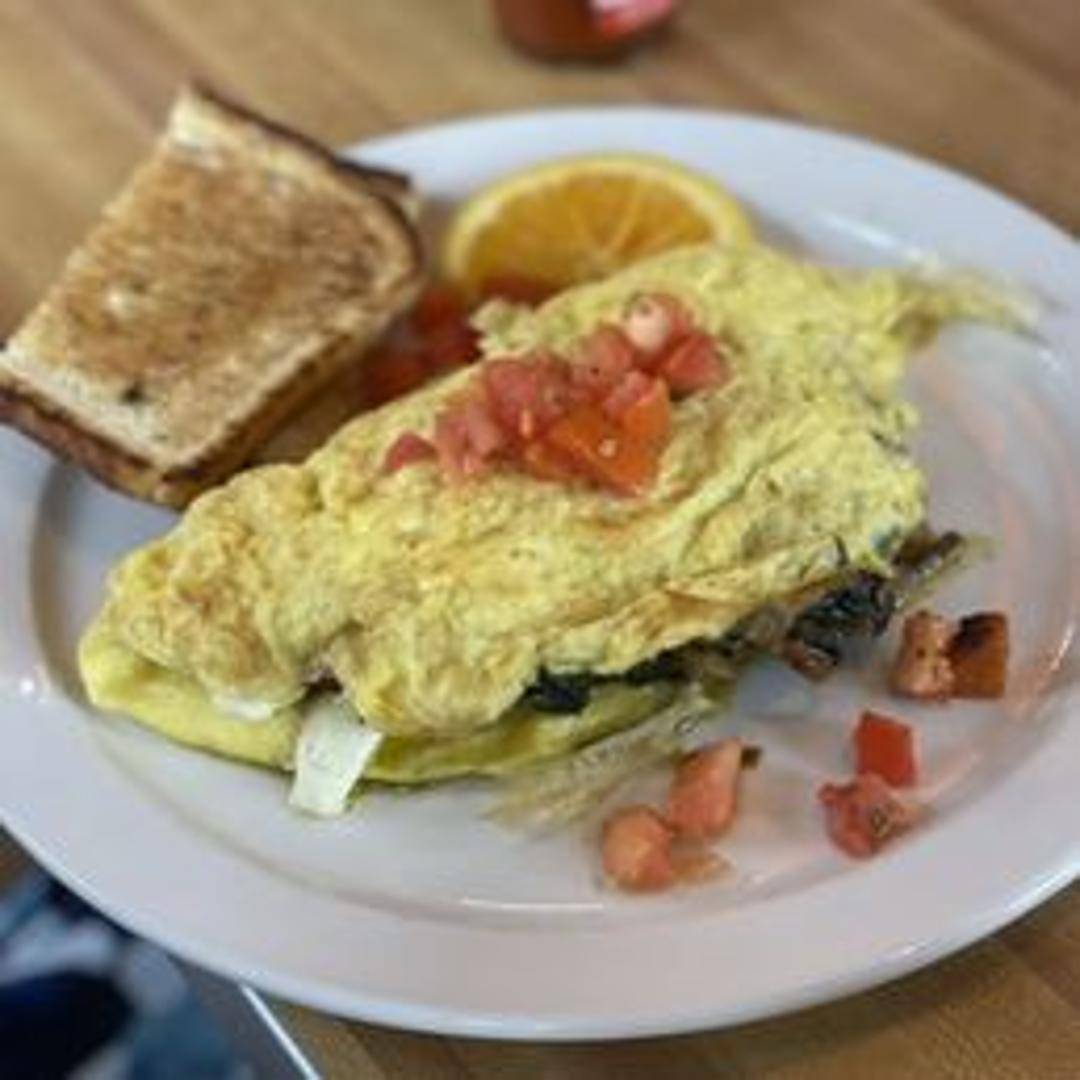 A fluffy three-egg omelet filled with a medley of seasonal vegetables, such as bell peppers, onions, mushrooms, spinach, and tomatoes. Topped with melted cheese. Served with your choice of toast and breakfast potatoes.