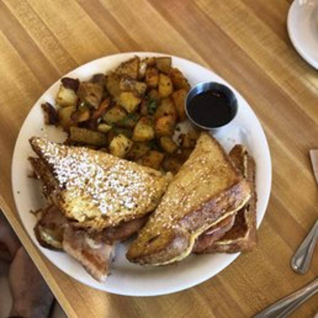 French-toasted bread layered with sliced ham, turkey, and melted Swiss cheese. Lightly dusted with powdered sugar and served with a side of raspberry jam.