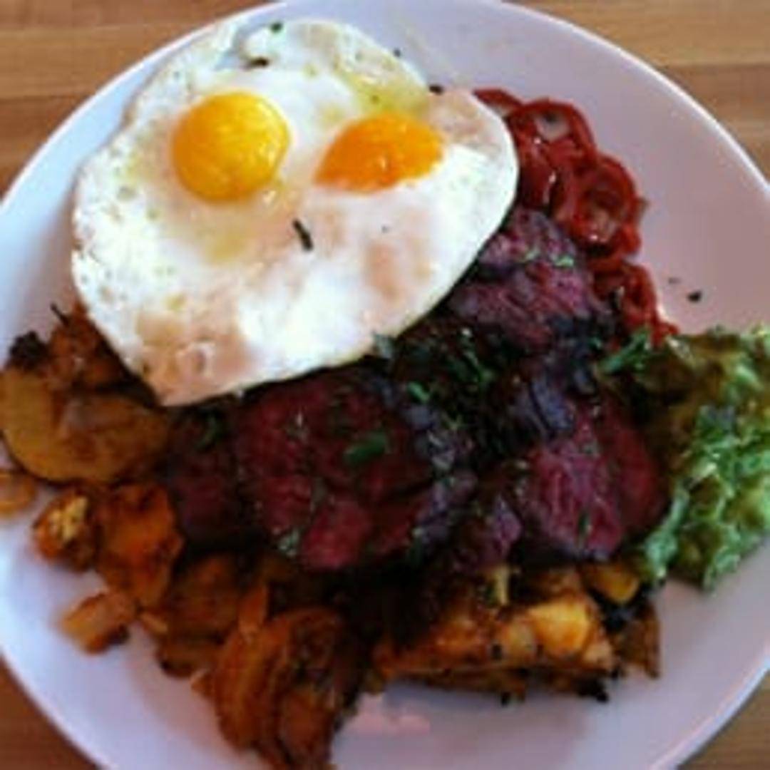 Grilled steak (typically a cut like sirloin or ribeye) served with two eggs cooked to order. Accompanied by breakfast potatoes or toast.