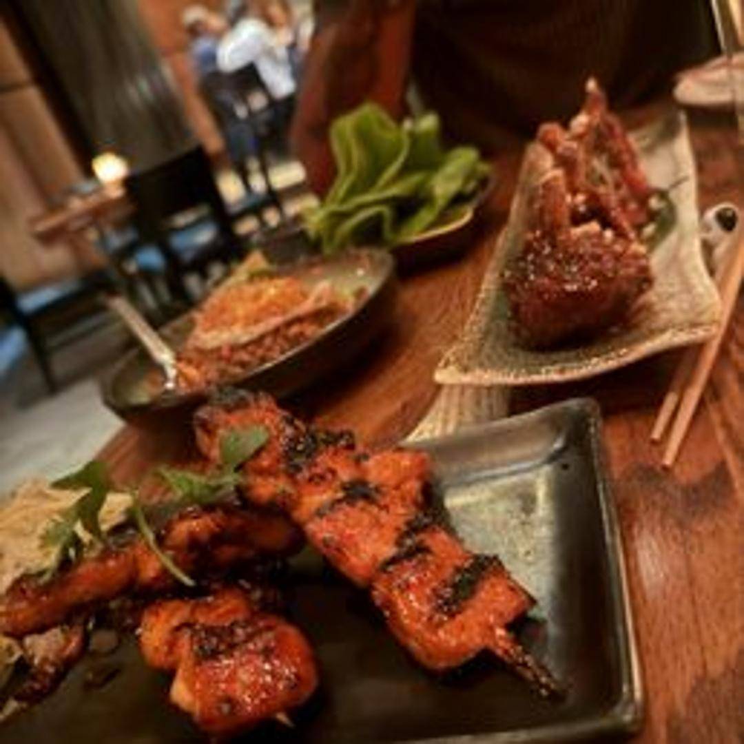 Grilled marinated chicken skewers served with a creamy peanut dipping sauce. Garnished with scallions and sesame seeds.