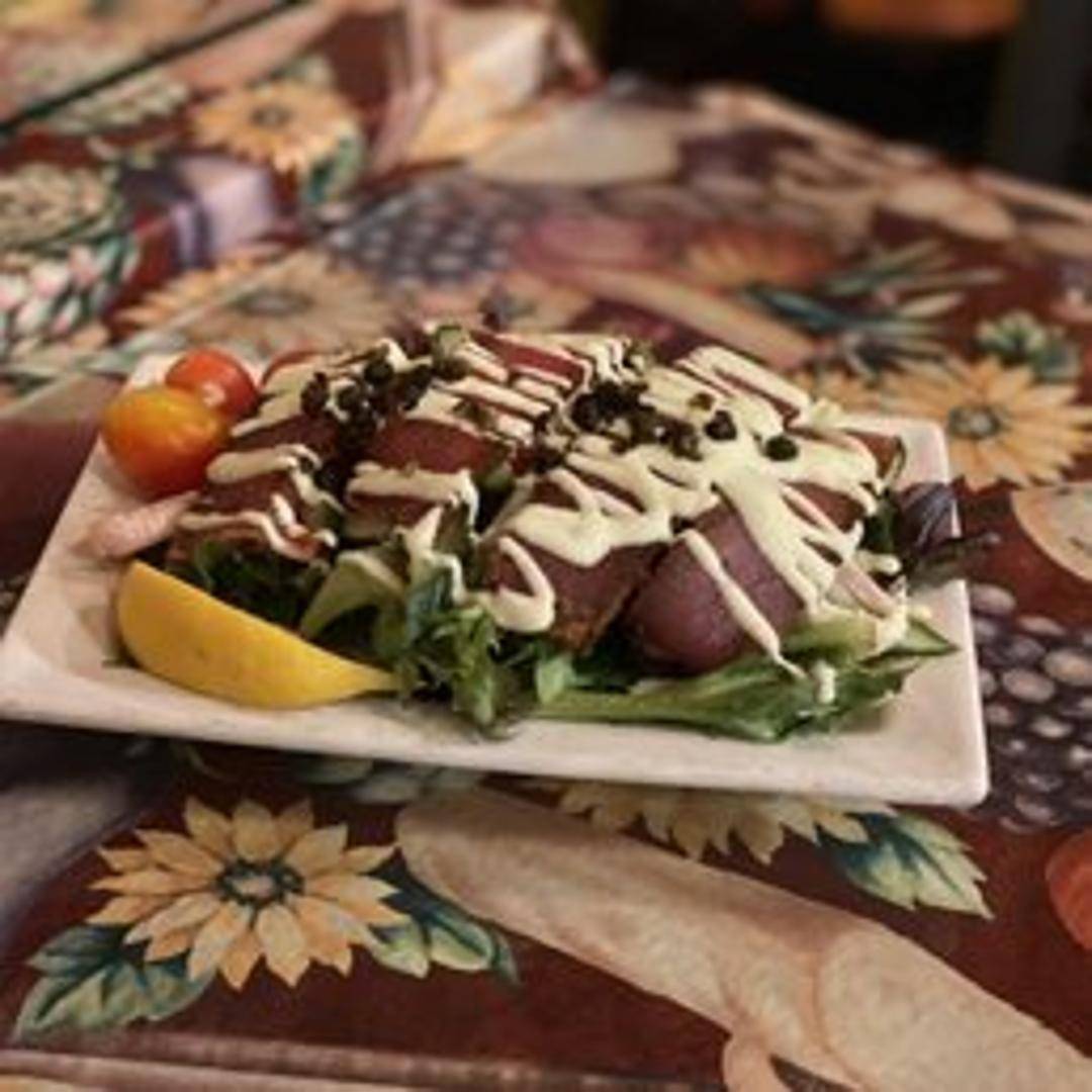 Thinly sliced raw tuna, artfully arranged and drizzled with a flavorful sauce. Garnished with fresh greens, capers, and a squeeze of lemon for a light and elegant tapa.