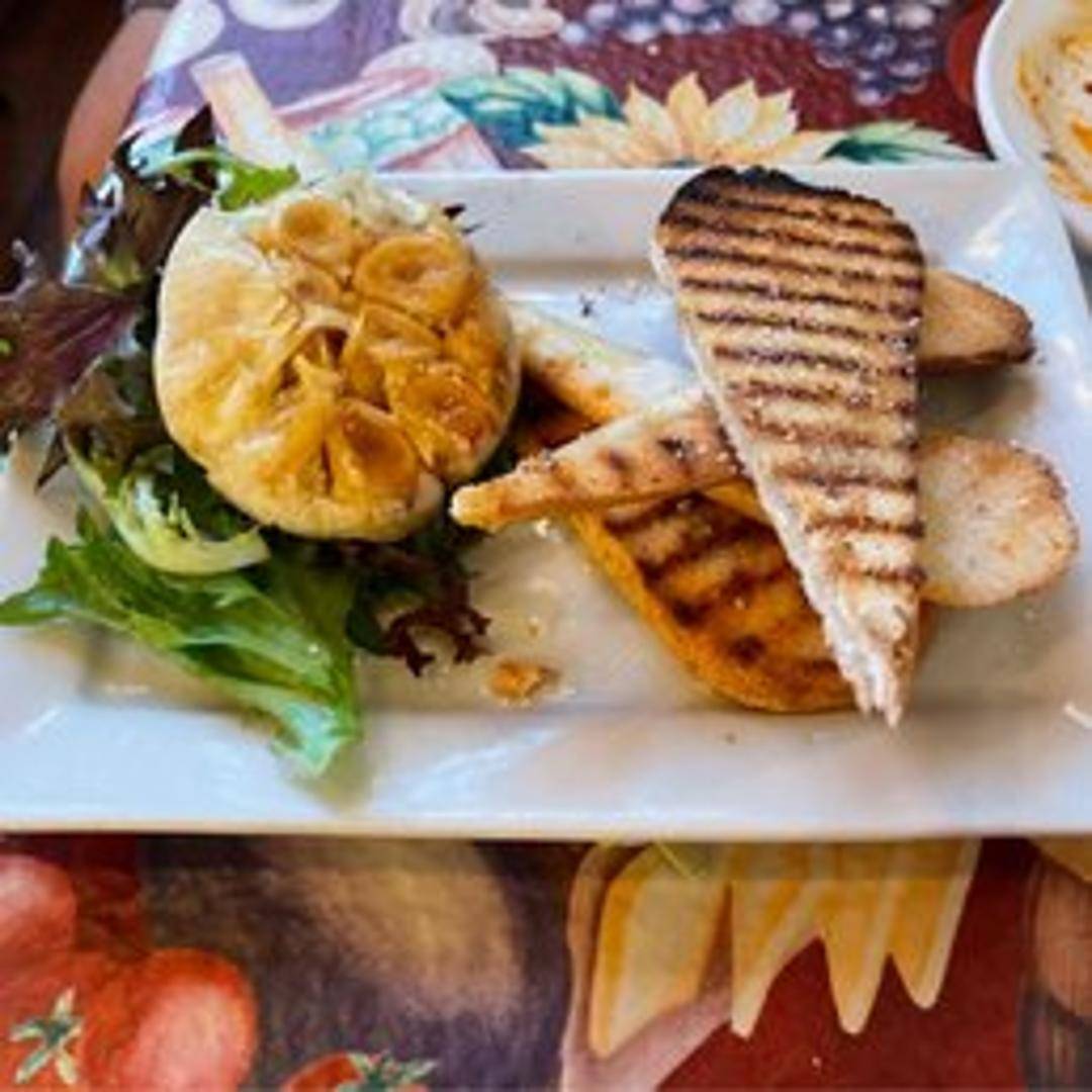Roasted whole garlic bulb, served with crusty bread and olive oil for spreading.