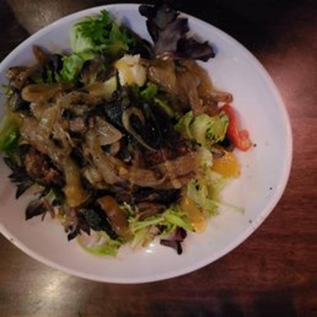 A deconstructed burger served as a salad. Seasoned ground beef on a bed of lettuce with tomato, onion, pickle, shredded cheese and your choice of dressing.