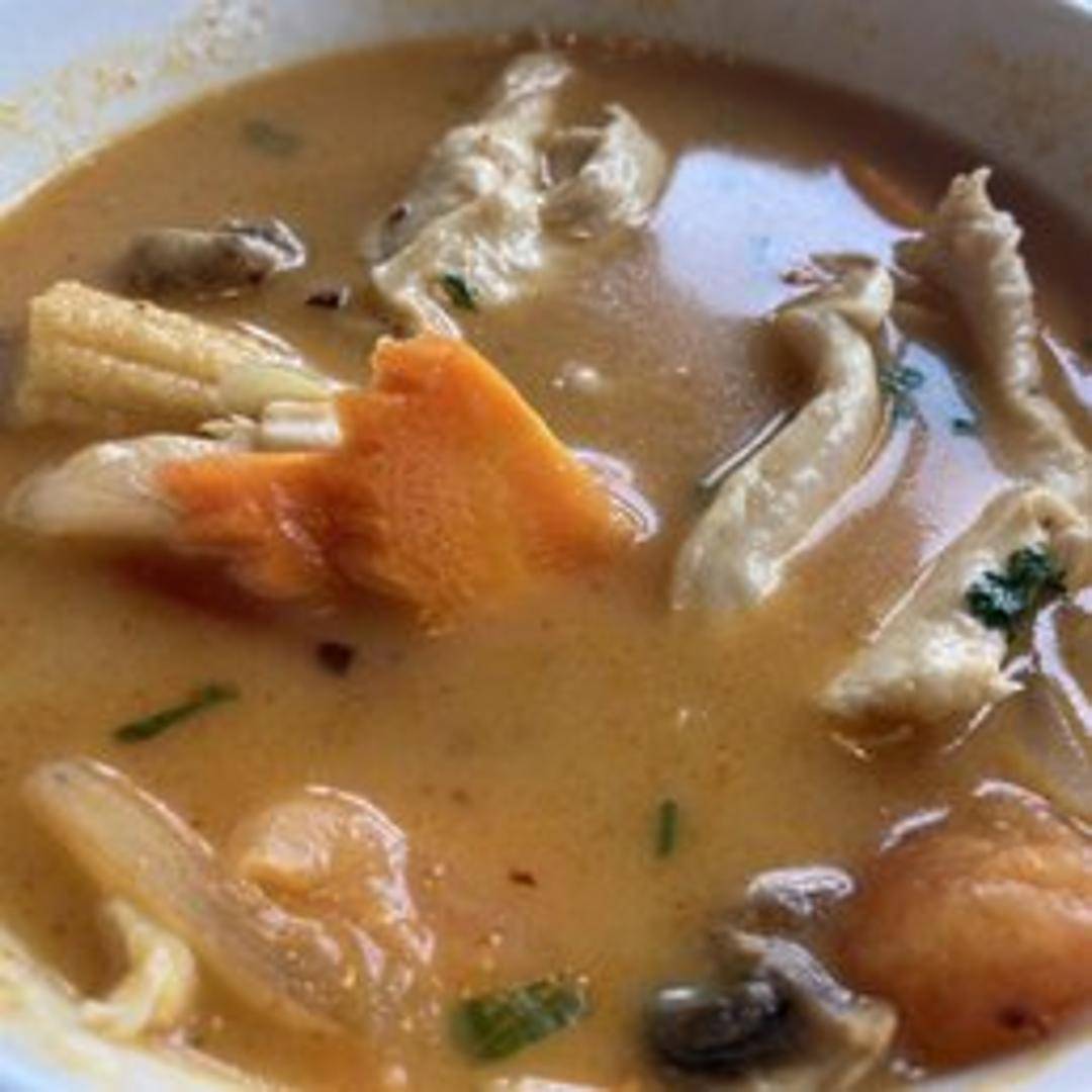 A creamy and aromatic coconut milk soup infused with galangal, lemongrass, kaffir lime leaves, mushrooms, and tomatoes. Choose your protein: chicken, tofu, or vegetables. Garnished with cilantro.