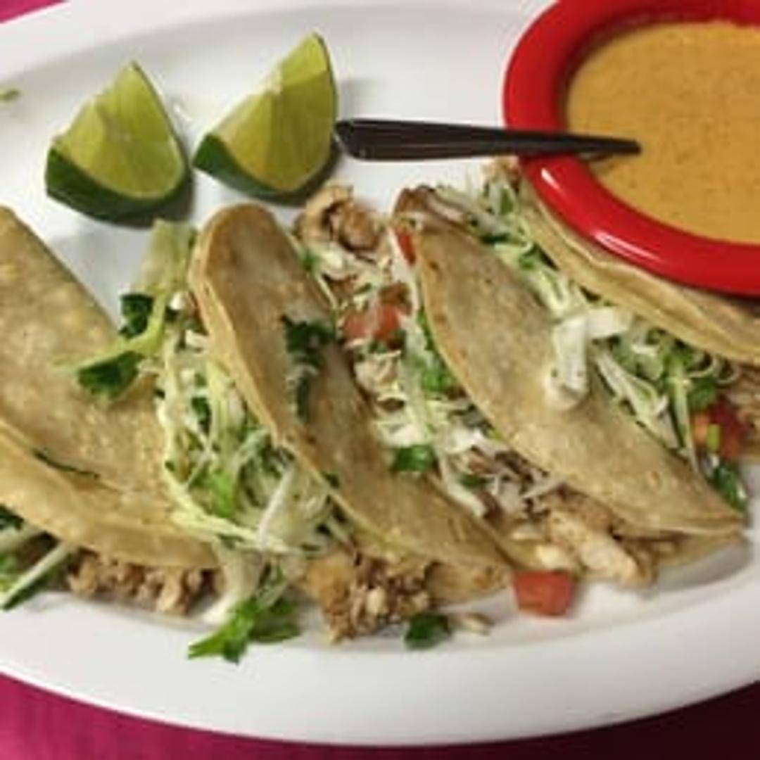 Two soft corn tortillas filled with grilled or fried white fish, topped with shredded cabbage, pico de gallo, and a creamy lime sauce.