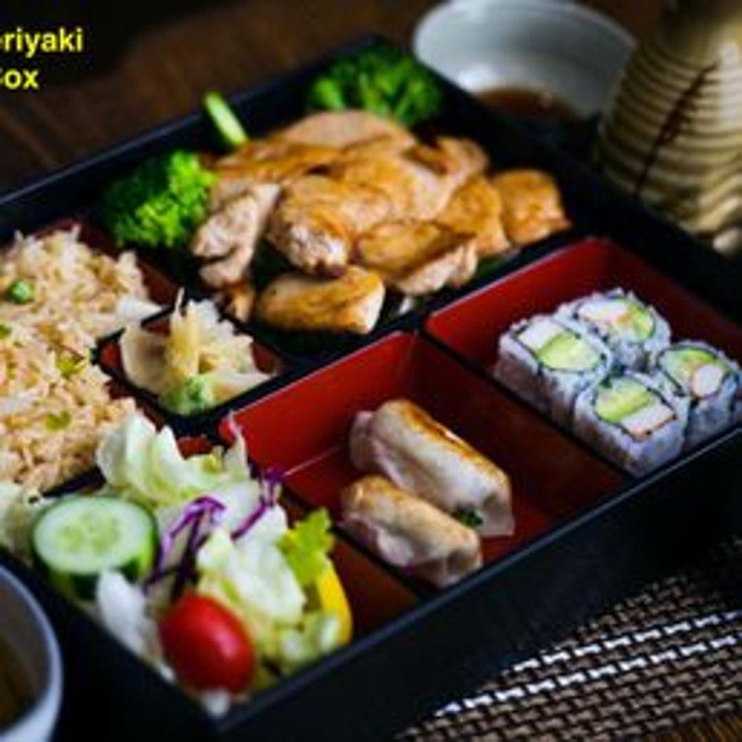 A convenient and well-rounded Japanese-style lunch presented in a beautifully partitioned box, offering a harmonious variety of dishes. Typically includes a main entree such as teriyaki chicken or crispy tempura, alongside fluffy steamed rice, a fresh green salad with ginger dressing, and often additional delights like California rolls, gyoza, or a side of miso soup, providing a complete and satisfying meal.