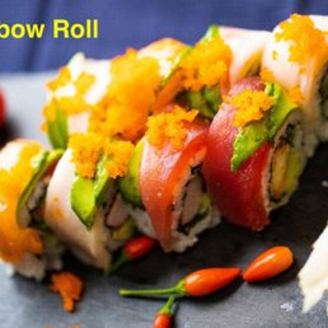 A vibrant and visually stunning sushi roll, showcasing a colorful array of fresh fish. This inside-out roll is typically topped with thinly sliced tuna, salmon, yellowtail, and avocado, creating a beautiful and diverse flavor profile.