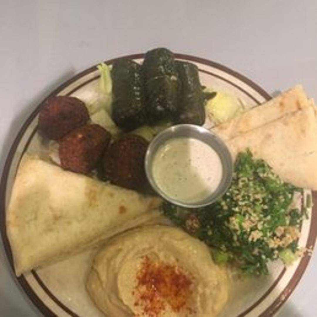 A colorful assortment of vegetarian delights. Includes hummus, baba ghanoush, falafel, dolmades (stuffed grape leaves), and a side of pita bread. A satisfying and flavorful meat-free option.