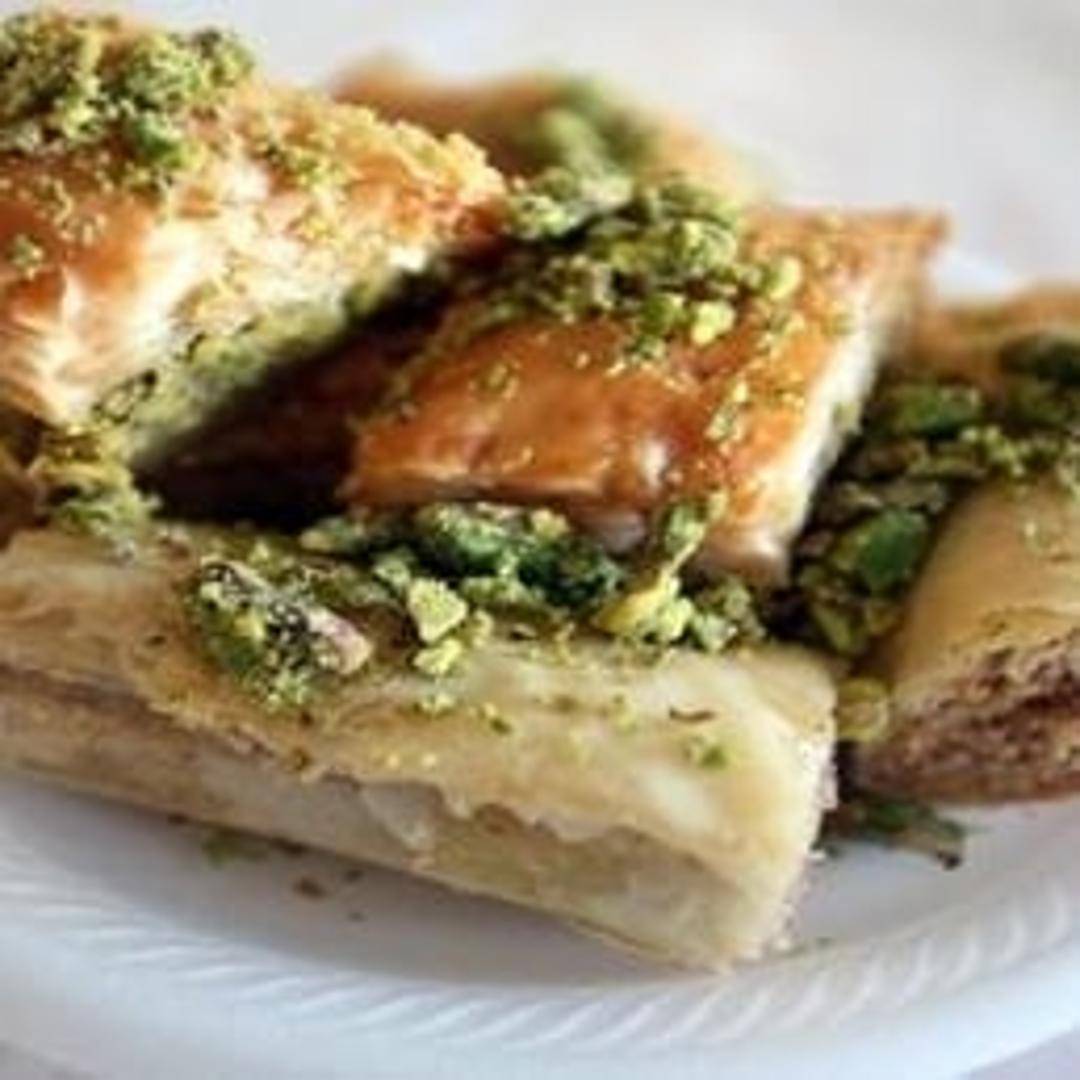 A sweet and flaky pastry made with layers of phyllo dough, chopped nuts, and soaked in a honey syrup. A classic Mediterranean dessert.