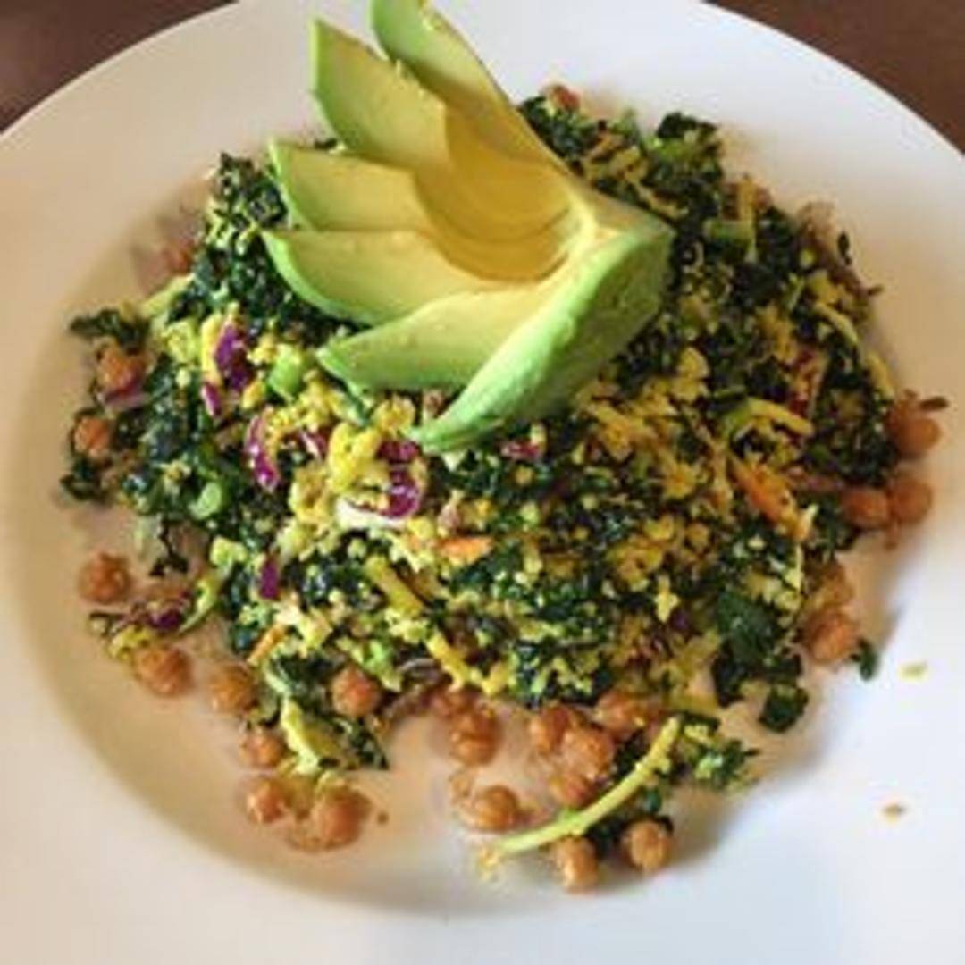 Fresh kale massaged with a light vinaigrette and topped with seasonal vegetables, nuts, and seeds. A healthy and refreshing salad.