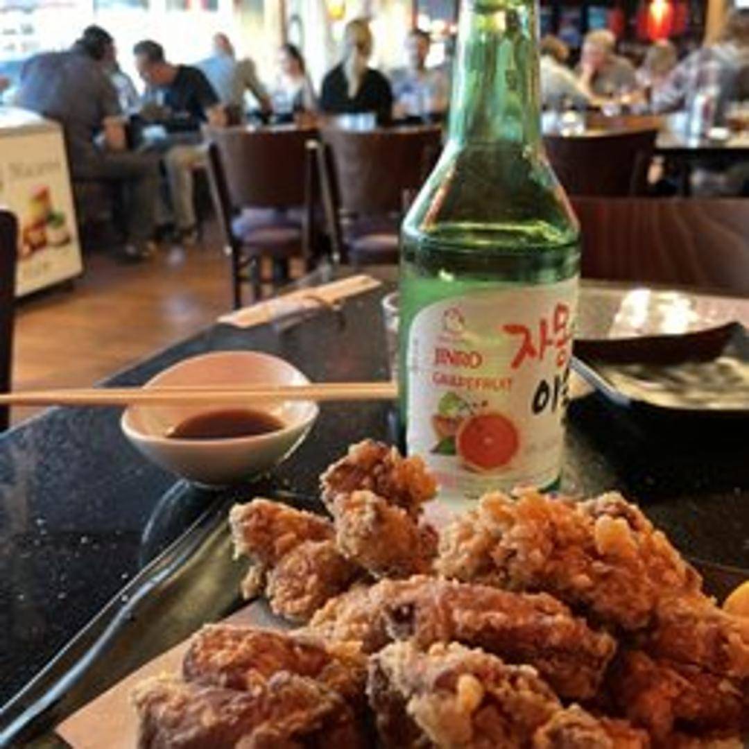 Japanese fried chicken. Marinated pieces of chicken, typically thigh meat, coated in potato starch or flour and deep-fried to a crispy golden brown. Often served with a lemon wedge or dipping sauce.