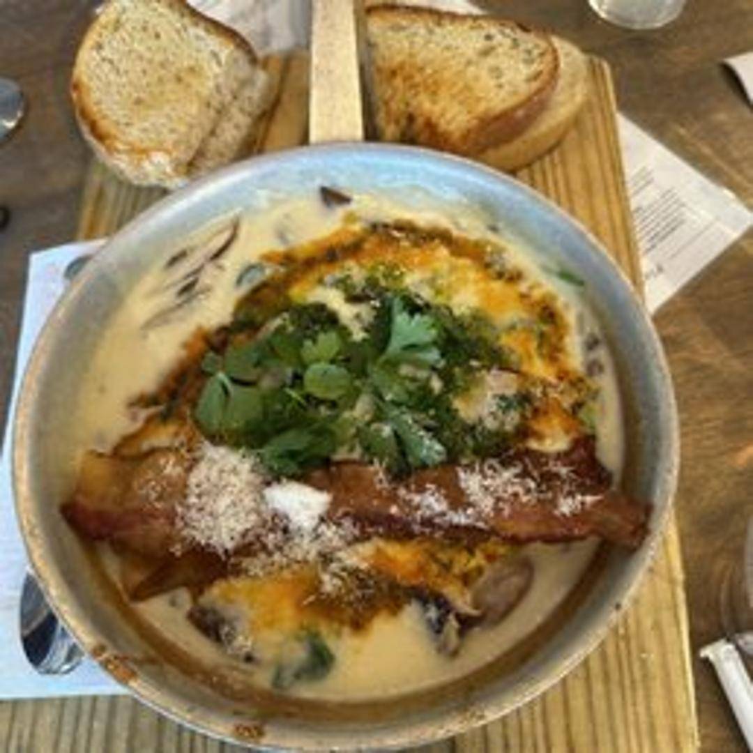 Two eggs poached in a spicy tomato sauce with potatoes, bacon, peppers, onions, and herbs. Served with challah bread.