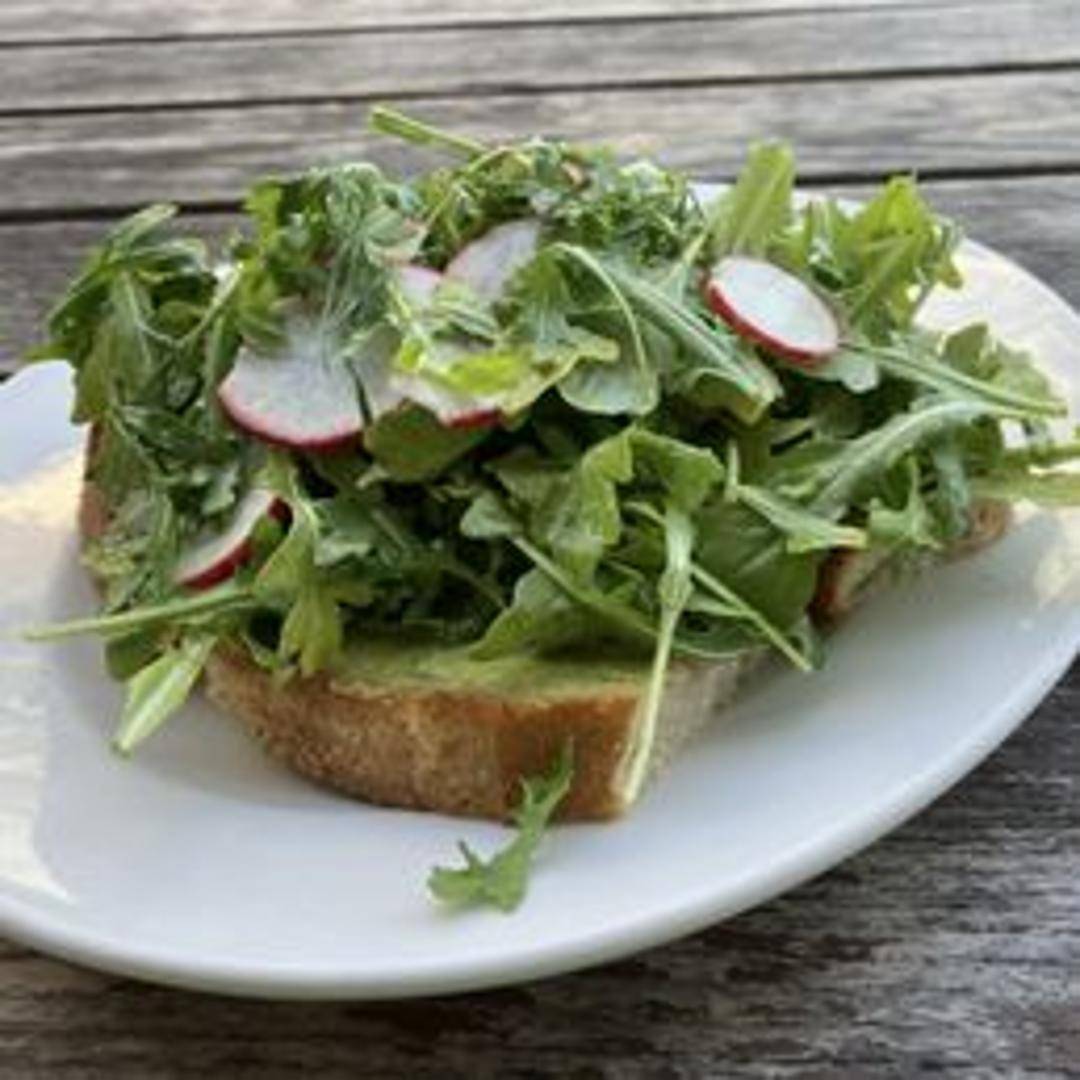 Toasted multigrain bread topped with mashed avocado, everything bagel seasoning, a sprinkle of red pepper flakes, and a drizzle of olive oil.