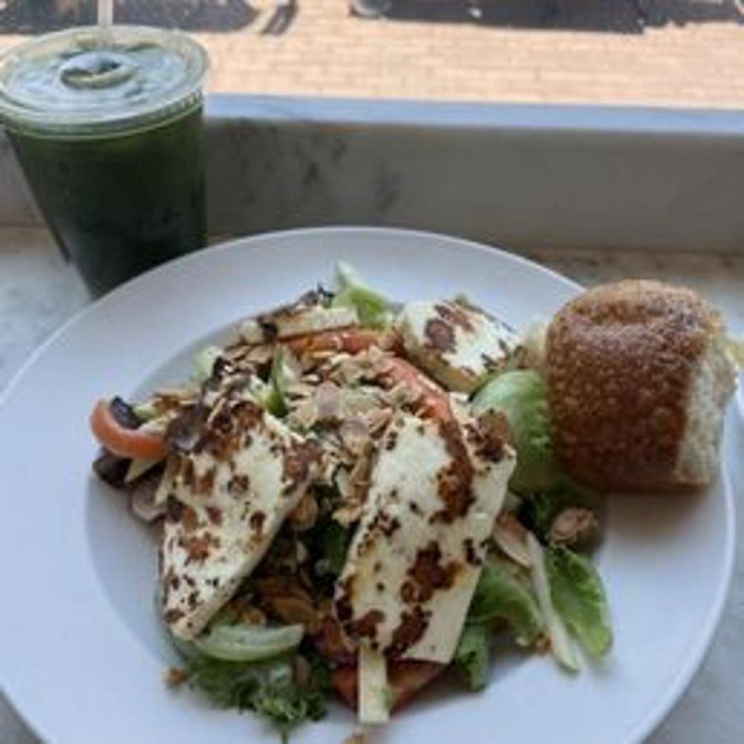 A vibrant and refreshing salad featuring grilled halloumi cheese, mixed greens, fresh vegetables (such as tomatoes, cucumbers, and peppers), and a flavorful dressing. The salty halloumi pairs perfectly with the crisp vegetables and tangy dressing, creating a balanced and satisfying meal.