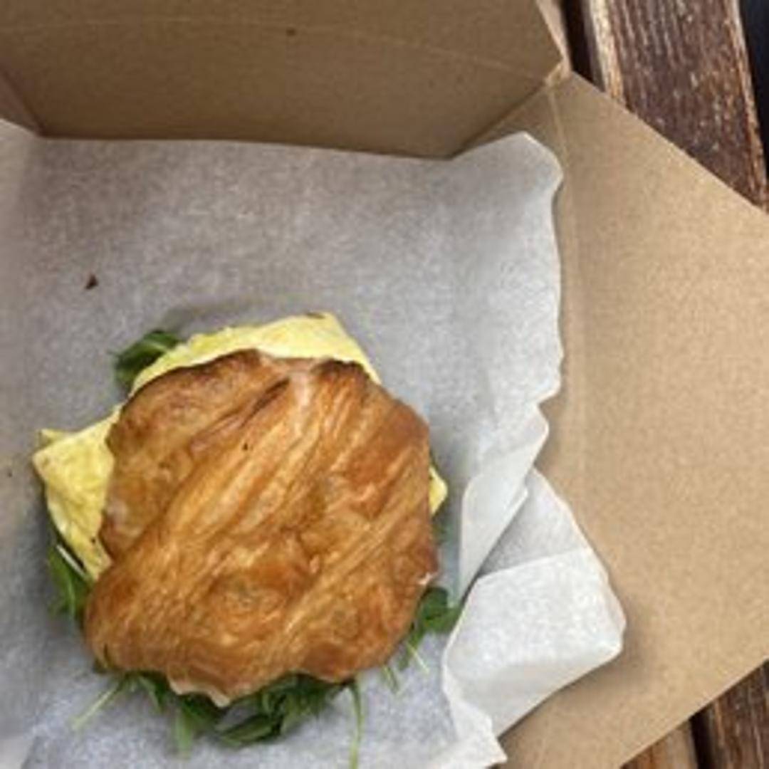 A sophisticated breakfast staple, featuring fluffy scrambled eggs nestled within Tatte's signature flaky, buttery croissant. This hearty yet elegant sandwich offers a harmonious blend of textures and flavors, often complemented by melted cheese or fresh herbs, making it a perfectly satisfying and gourmet start to your day.