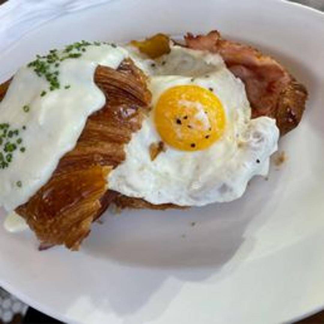 A classic French bistro staple featuring layers of rich béchamel sauce, thinly sliced savory ham, and melted Gruyère cheese, all nestled between slices of artisanal sourdough bread. Crowned with a perfectly fried egg, its golden yolk adds an extra layer of richness, creating a truly decadent and satisfying open-faced sandwich.