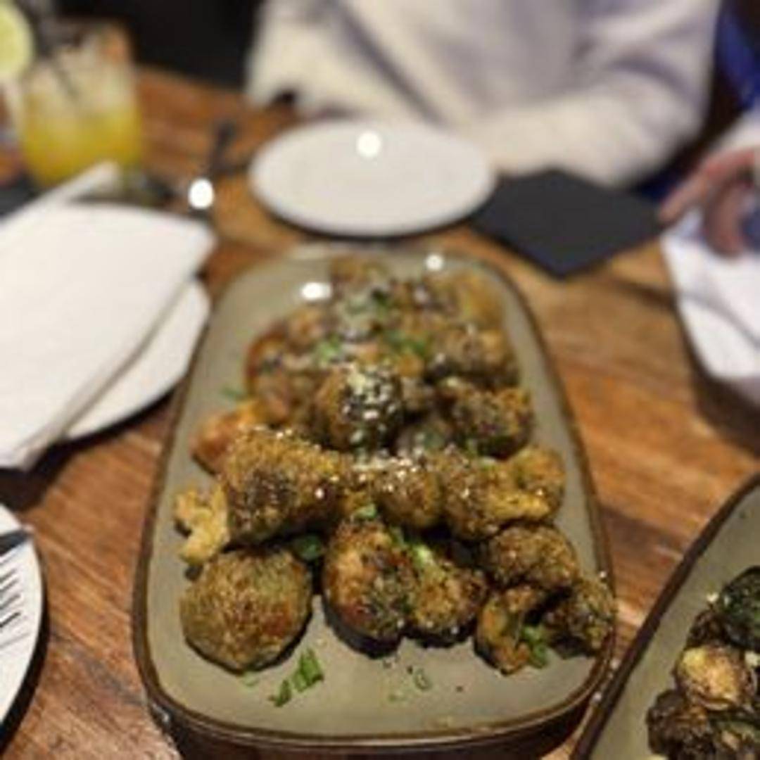 Crispy fried broccoli florets tossed in a sweet and spicy Bang Bang sauce. Garnished with sesame seeds.