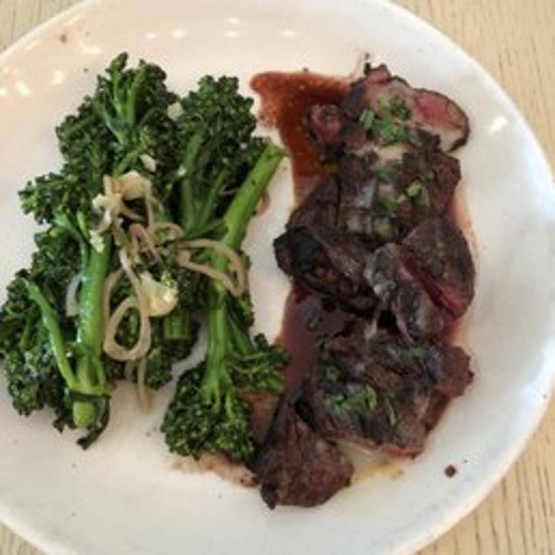 A hybrid vegetable similar to broccoli, but with longer, thinner stalks and smaller florets. Expect a tender texture and a slightly sweet, mild flavor. Likely prepared with olive oil, salt, and pepper; possibly roasted, grilled, or sautéed.