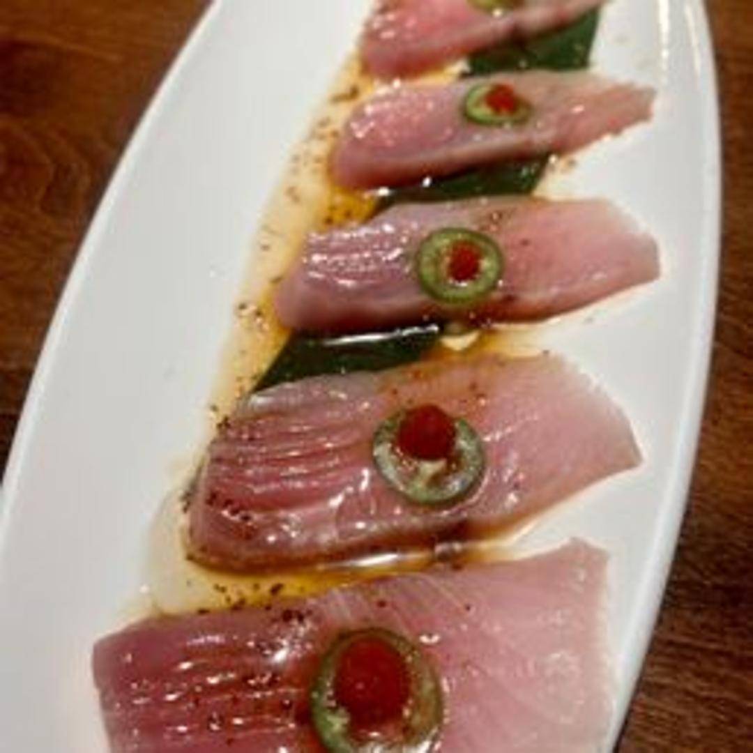 Thinly sliced, fresh Hamachi (yellowtail) arranged in a carpaccio style. Drizzled with a delicate sauce and garnished for enhanced flavor and visual appeal. This dish offers a clean and refreshing taste.