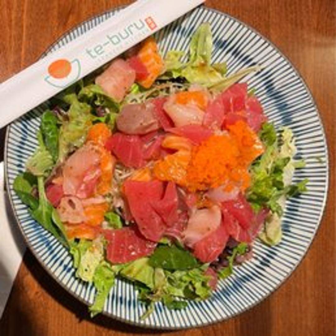 A vibrant salad featuring assorted fresh sashimi atop a bed of greens. Tossed with a light and flavorful dressing, it's a refreshing and healthy option.