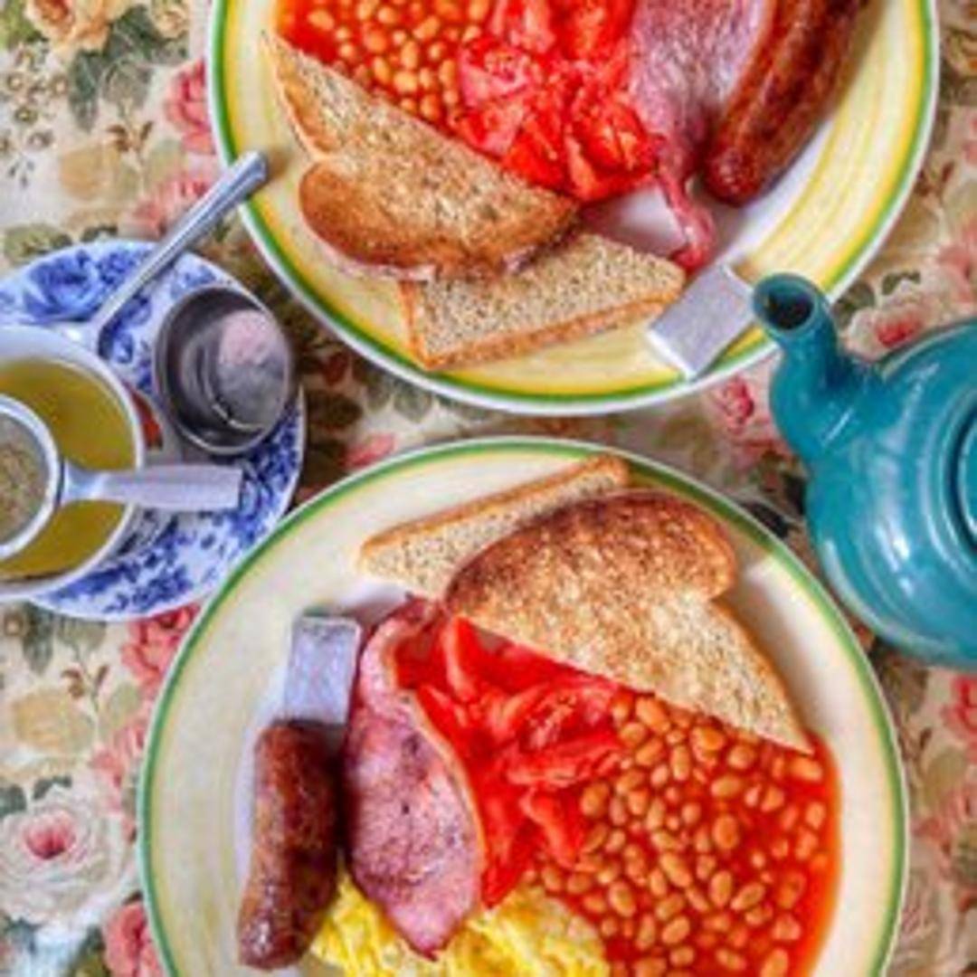 A hearty British feast! Enjoy bangers (pork sausages), rashers (British bacon), fried egg, baked beans, grilled tomato, mushrooms, and black pudding, served with toast. A true taste of Britain for breakfast or any time of day.