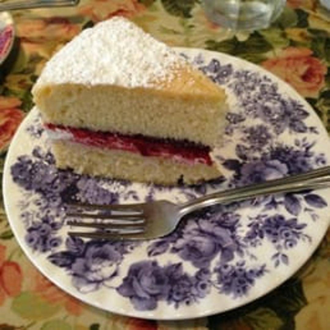 A classic British sponge cake, light and airy, filled with fresh whipped cream and a layer of sweet strawberry or raspberry jam. A delightful treat perfect for afternoon tea.