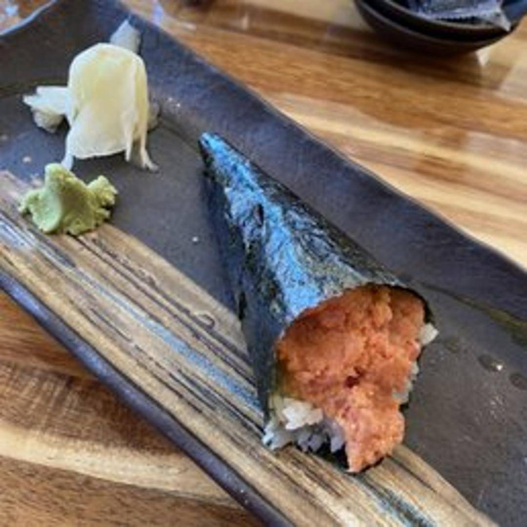 A vibrant sushi roll showcasing fresh, finely diced tuna tossed in a zesty and spicy house-made sauce, perfectly complemented by crisp cucumber or scallions, all neatly rolled with seasoned sushi rice and delicate nori seaweed for a flavorful kick.