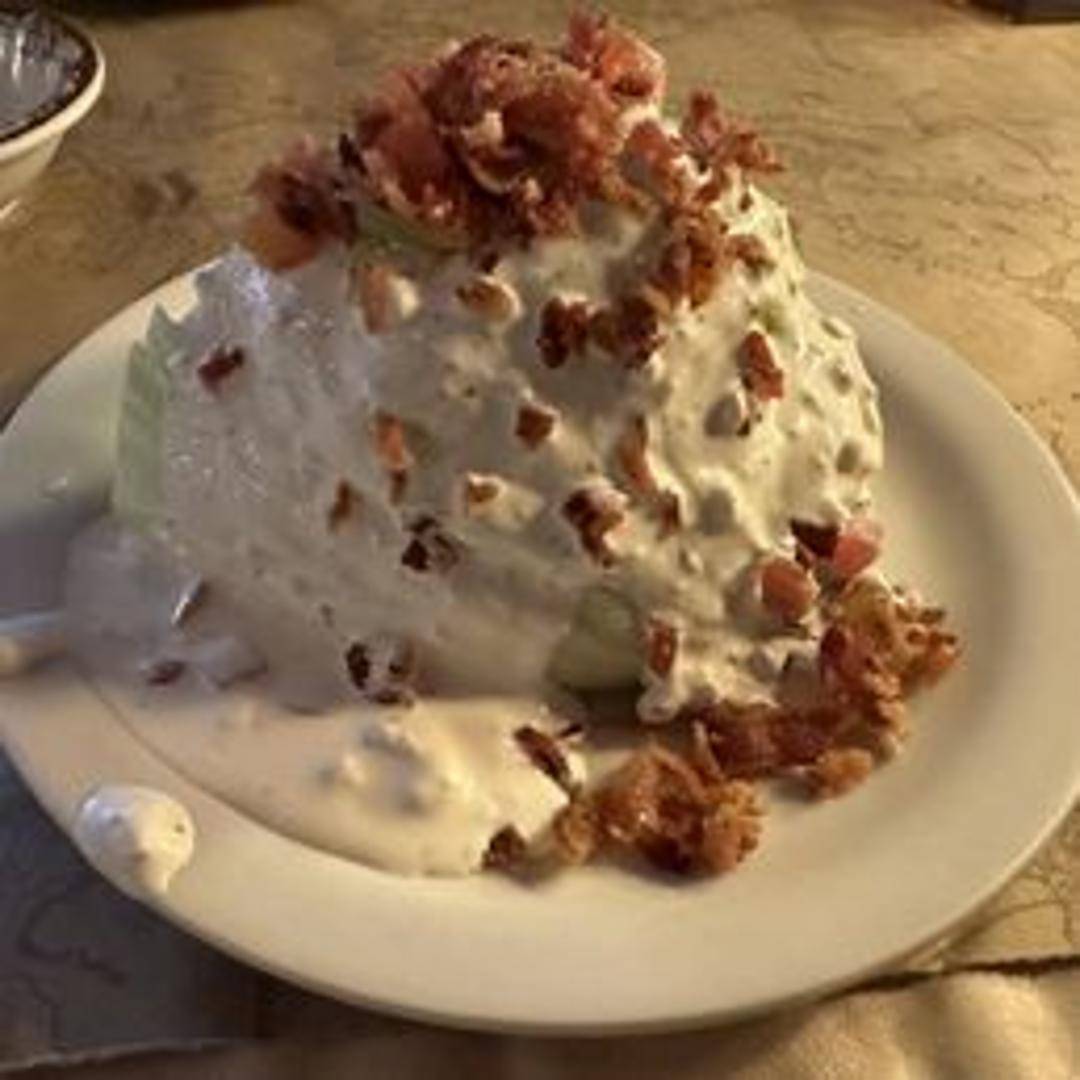 A crisp wedge of iceberg lettuce topped with creamy blue cheese dressing, chopped bacon, diced tomatoes, and a sprinkle of blue cheese crumbles.