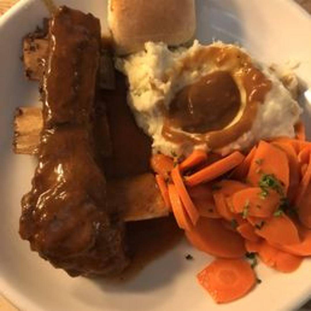 Slow-braised bison short ribs, resulting in tender, fall-off-the-bone meat with a rich and savory flavor.