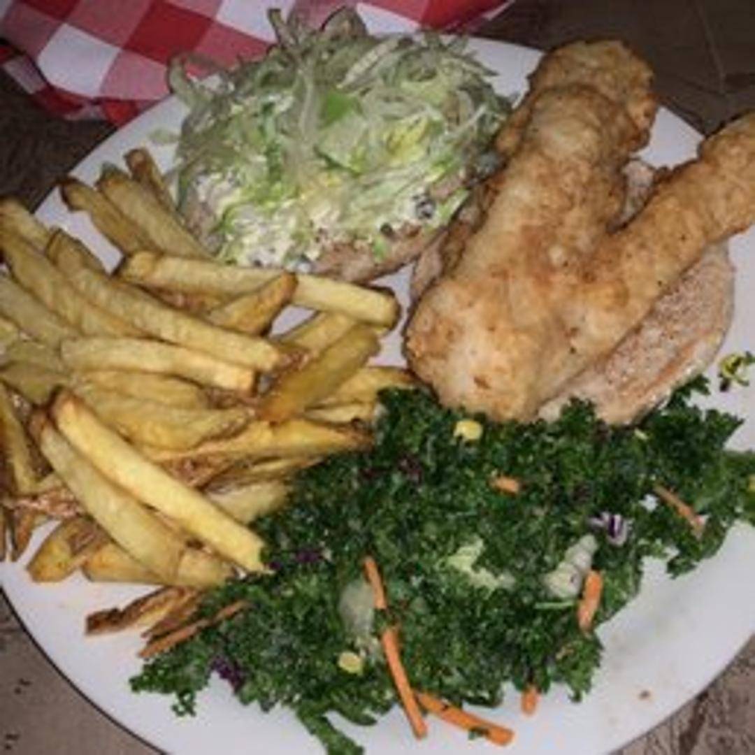 A flaky cod fillet, breaded and fried, served on a toasted bun with lettuce, tomato, and tartar sauce.