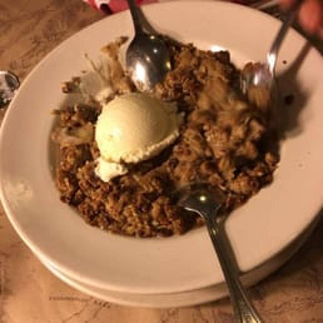 A warm and comforting dessert featuring baked apples with a crispy oat topping. Served with a scoop of vanilla ice cream.