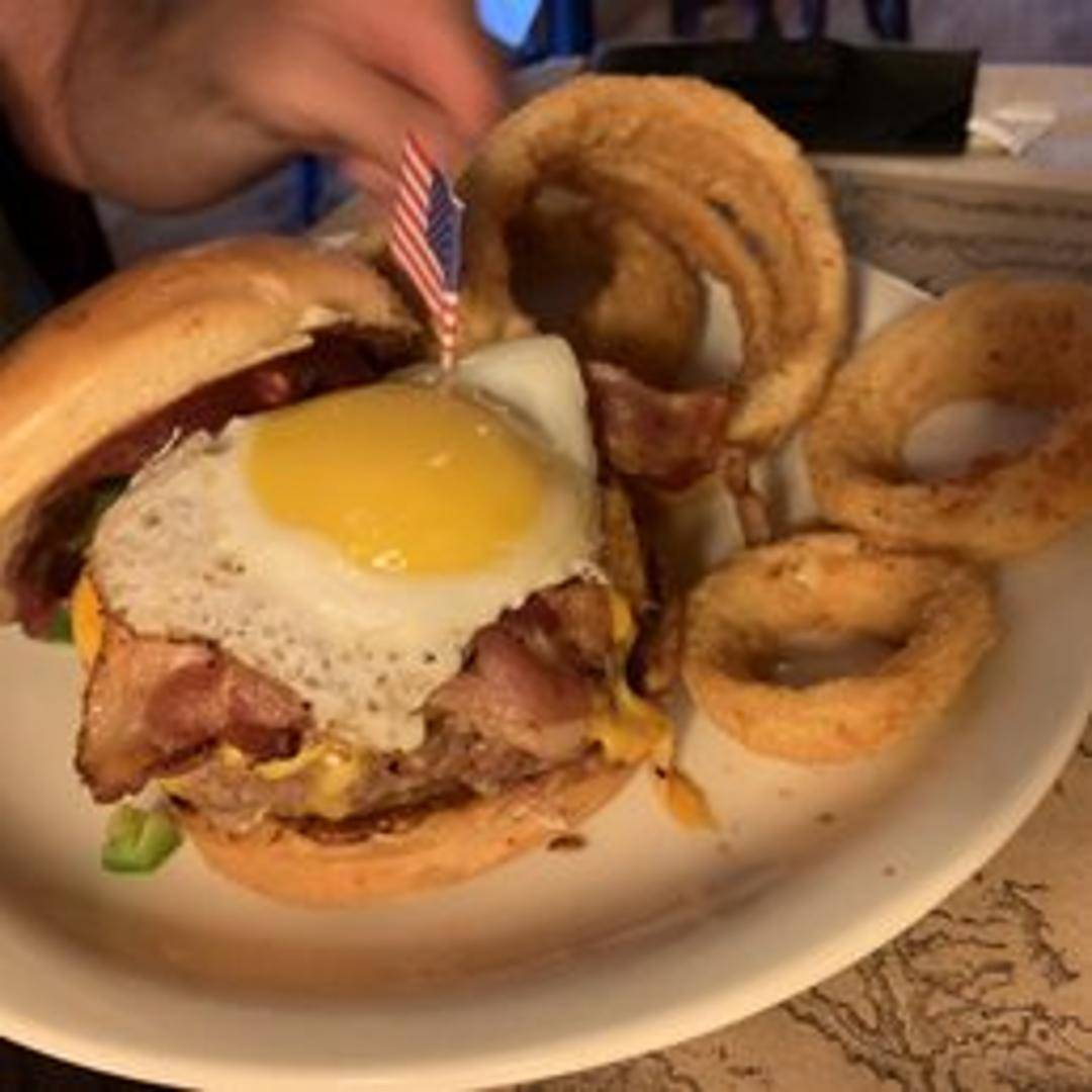 A flavorful burger featuring sharp cheddar cheese, bacon, and a tangy barbecue sauce. Served on a toasted bun with lettuce, tomato, and onion.
