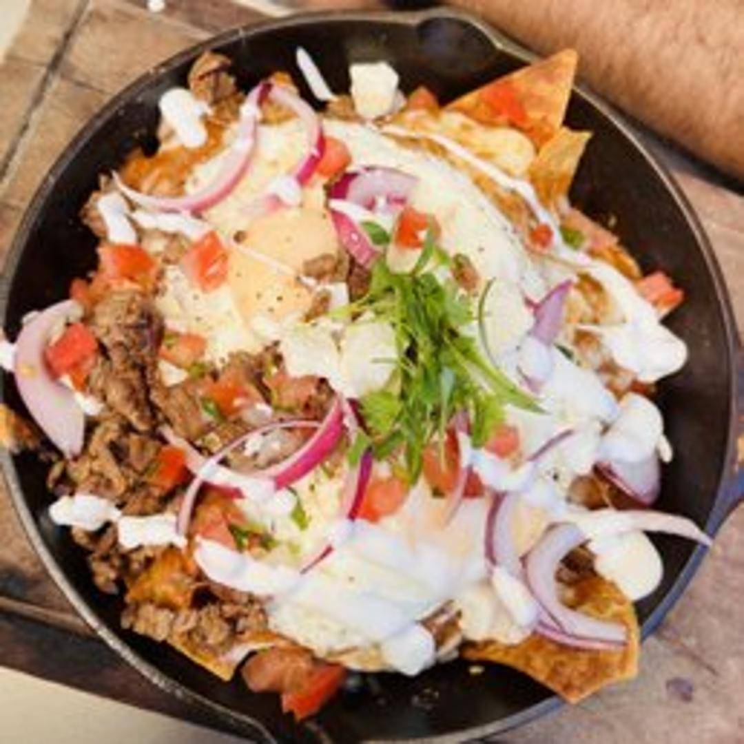Crispy tortilla chips simmered in your choice of red or green salsa, topped with queso fresco, crema, and onions. Served with your choice of eggs and a side of beans.