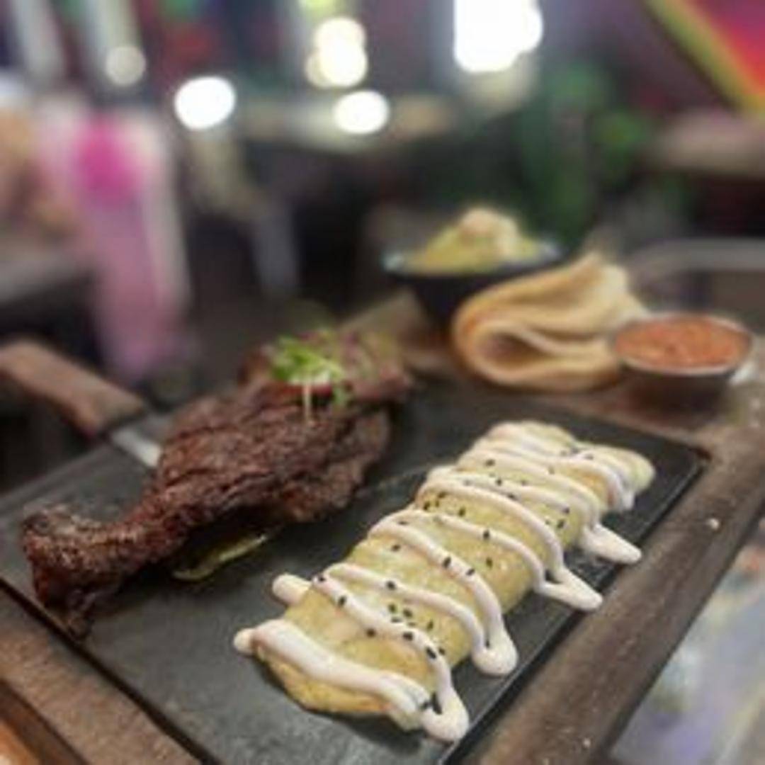 Grilled marinated steak served with rice, beans, grilled onions, guacamole, and tortillas.