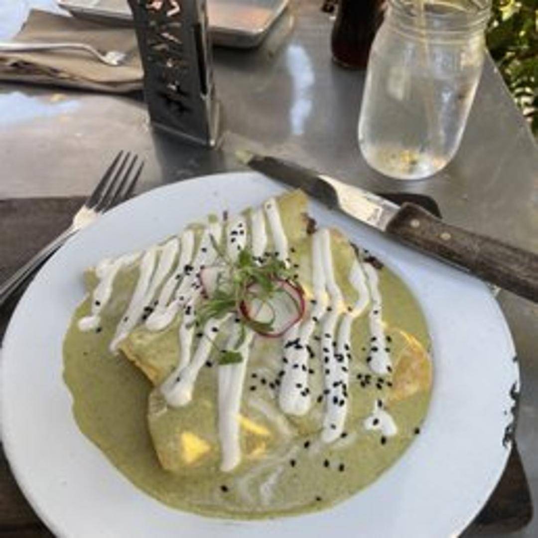 Corn tortillas filled with your choice of protein and cheese, smothered in your choice of sauce (red, green, or mole). Topped with cheese, onions, and crema. Served with rice and beans.