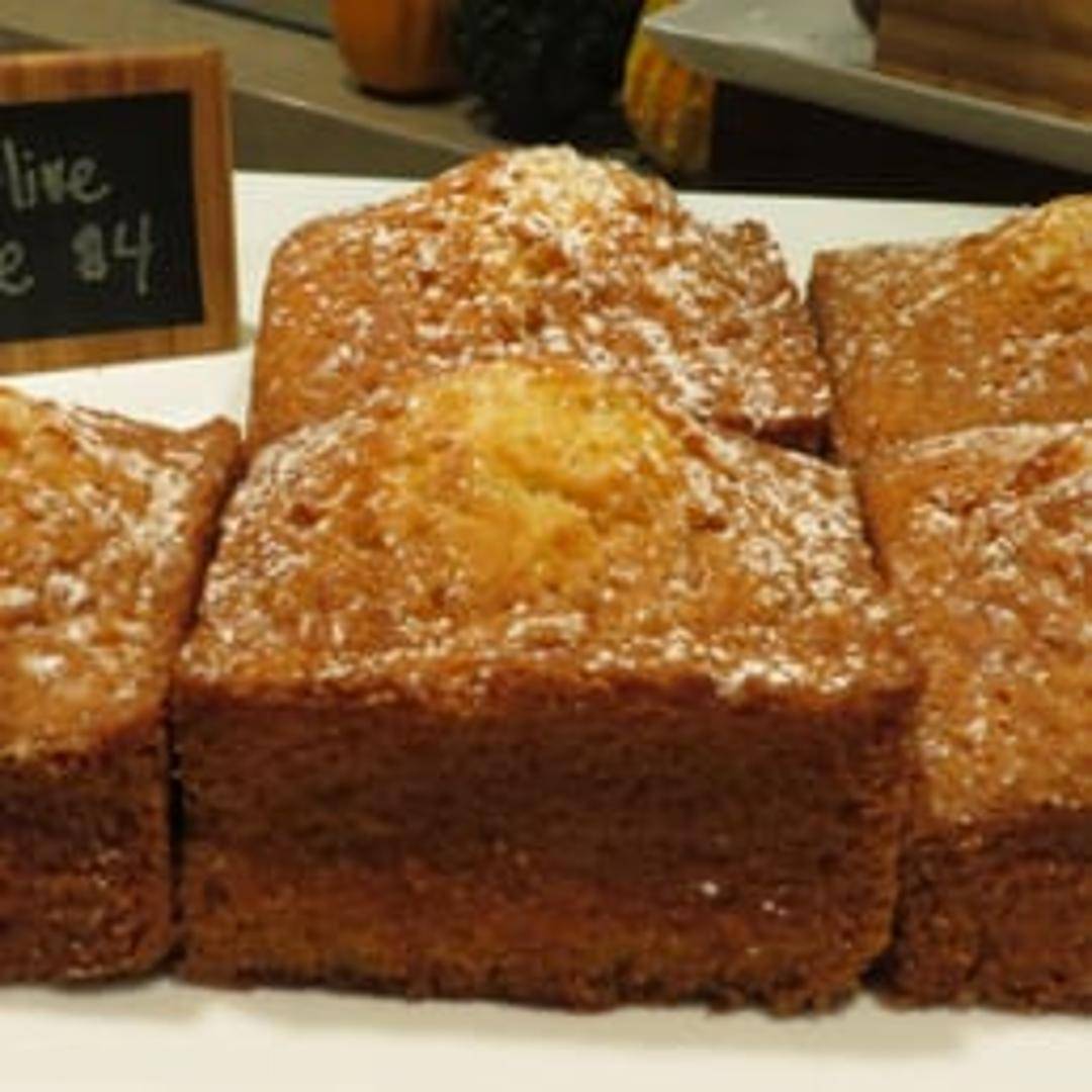 A moist and flavorful cake made with olive oil. It often features a light and airy texture, with a delicate sweetness and subtle fruity notes from the olive oil. May be served plain or with a dusting of powdered sugar, citrus zest, or a drizzle of glaze.